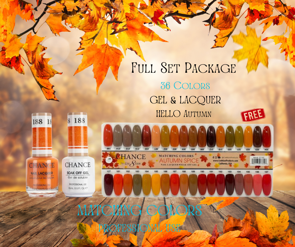 Prepare for the fall season with our Chance Matching Duo Full Set featuring 36 autumn shades in gel and lacquer formulas. This set has a free color chart, topcoat, and 10-pcs nail stickers to complete your perfect fall look.