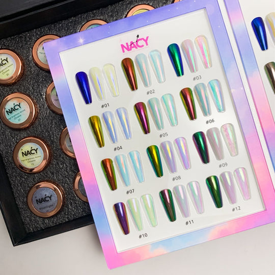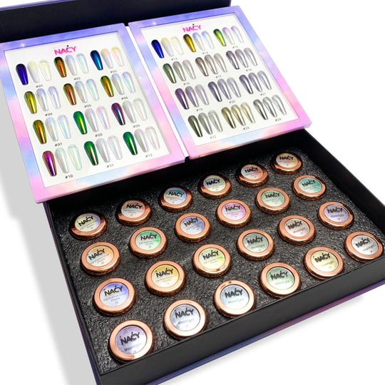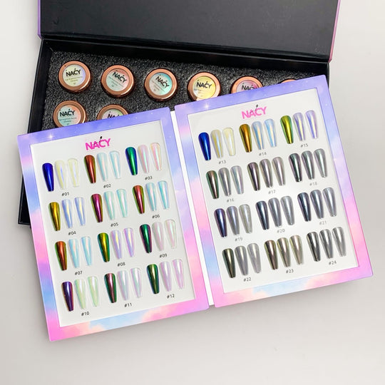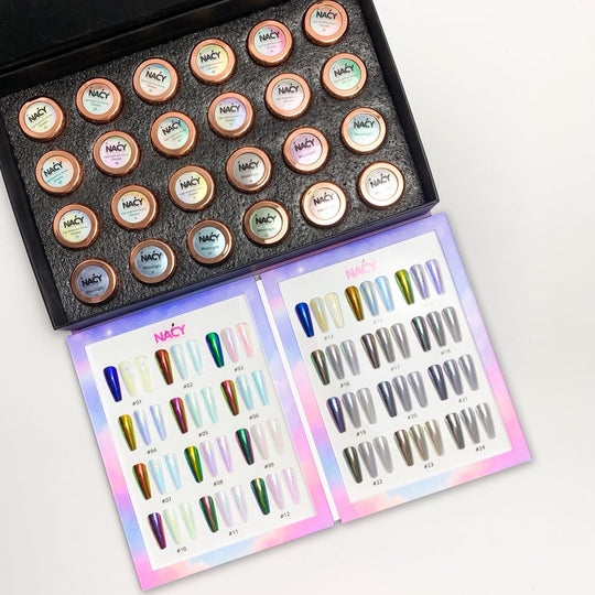 Regular price $180.00The Nacy High Brightness Aurora Chrome Mirror Powder Set features 24 vibrant colors, designed to deliver a dazzling, mirror-like finish with an iridescent aurora effect. This high-quality powder set offers a smooth, ultra-fine texture that creates... -