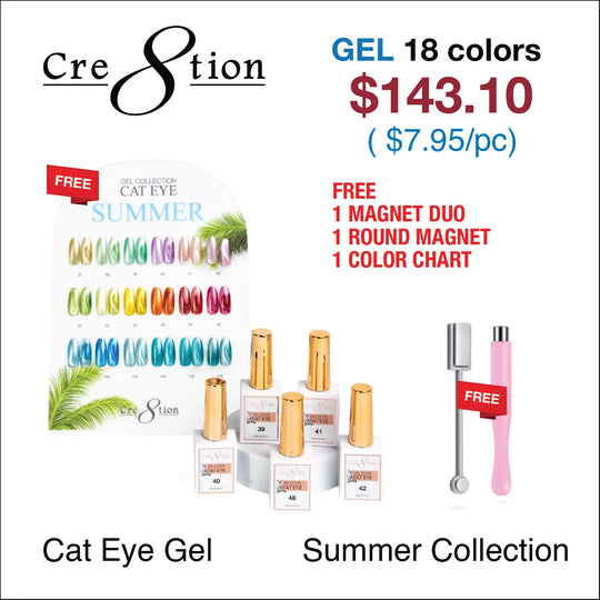Regular price $143.10Cre8tion Cat Eye Gel Summer Collection - 18 colors (#37-48 & #139-144) NOTE : Full Set Orders may take an additional business day to pack and ship. All colors are not guaranteed to be available. If some colors... -