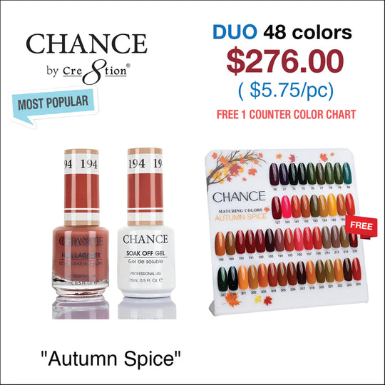 Regular price $276.00Chance Matching Color Gel & Nail Lacquer 0.5oz - Autumn Spice Collection Most Popular Includes 48 colors:55, 57, 74, 75, 76, 77, 78, 79, 98, 127,160, 181, 182, 183, 184, 185, 186, 187, 188, 189, 190,... -