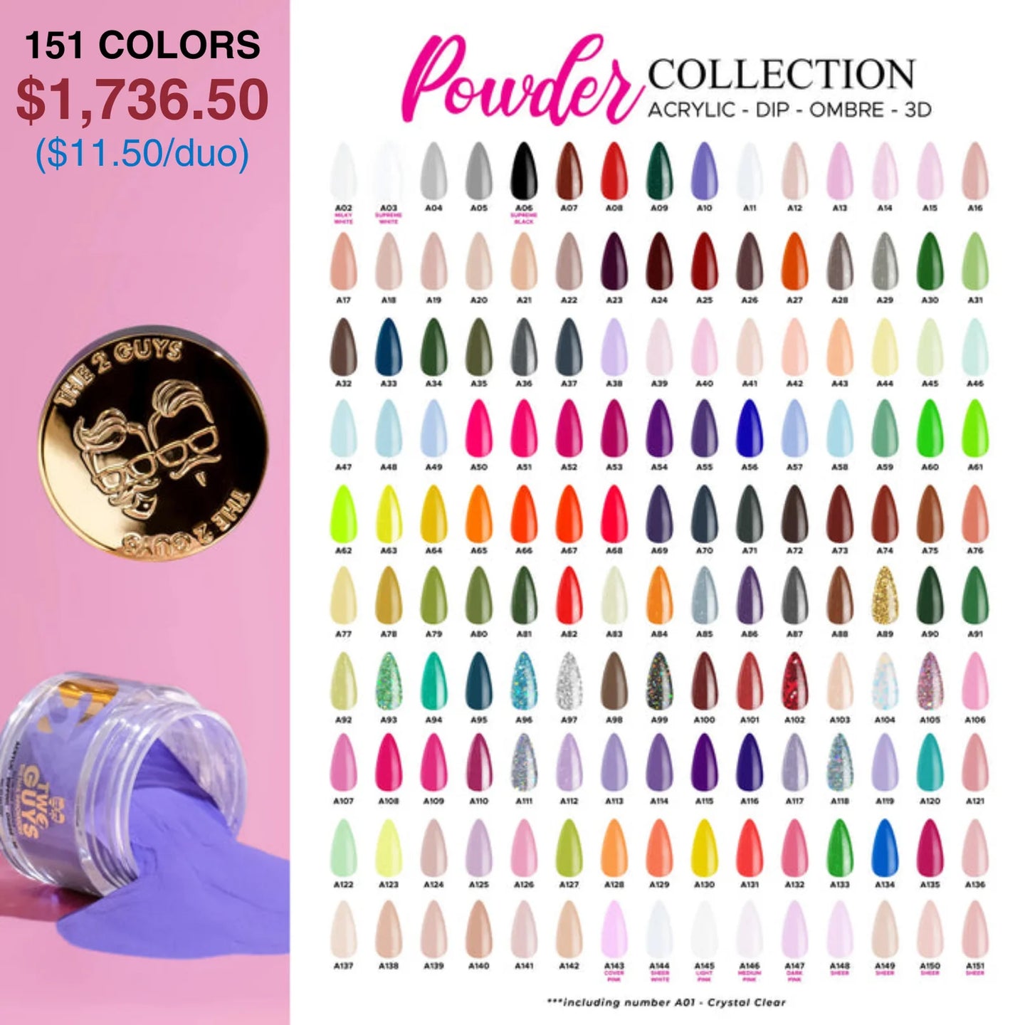 - Full Set Inclusions: This set includes all 151 2Guys ALL-IN-ONE POWDER (2 oz. jars) and a convenient color swatch book.