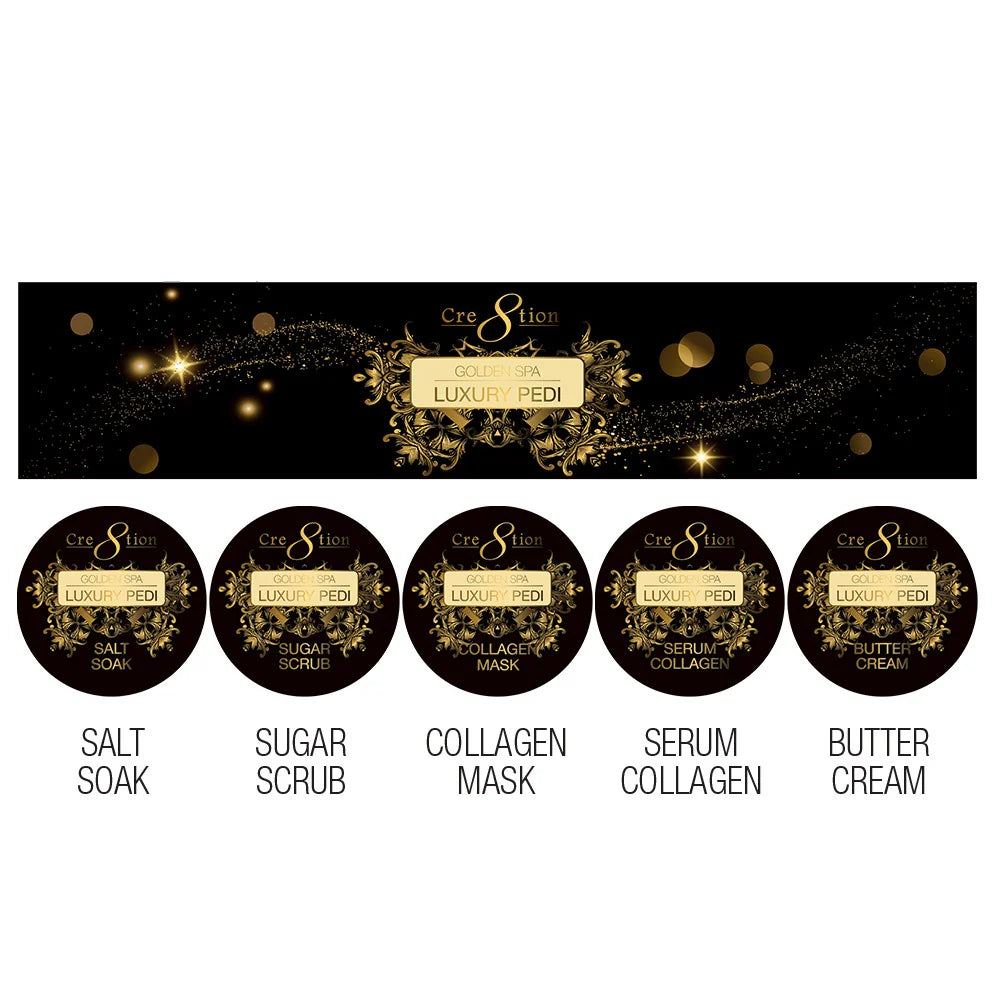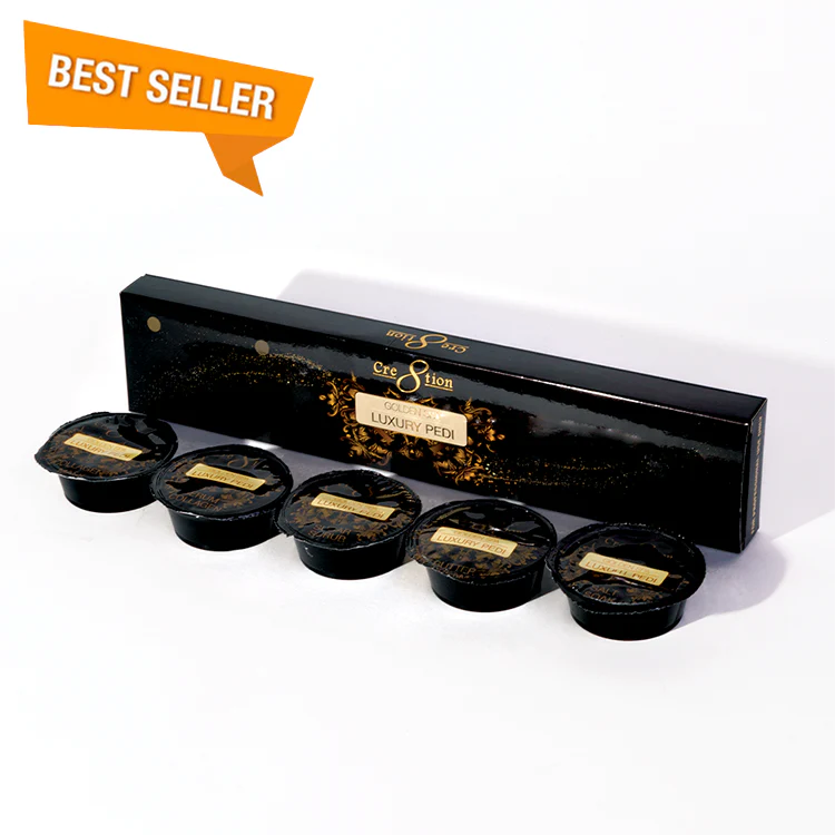 Cre8tion Luxury Golden Pedicure Spa 5-in-1 Pedicure Kit. Transform every pedicure into a luxurious spa experience with the Cre8tion Luxury Golden Pedicure Spa 5-in-1 Pedicure Kit. Crafted to invigorate the senses and nourish the skin, this kit is infused with the refreshing essence of Red Ginseng. The perfect blend of nature’s best exfoliants and moisturizers, each kit is designed to give your clients silky smooth, hydrated feet in just four easy steps.