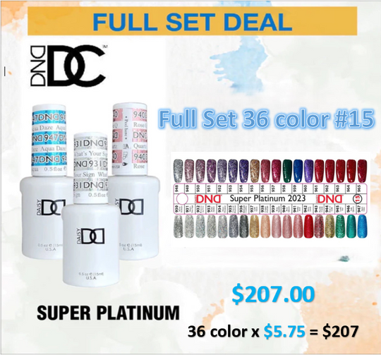 No reviewsRegular price $207.00DND Super Platinum Gel Collection - Full Set of 36 Stunning Colors Discover the ultimate nail art experience with the DND Super Platinum Gel Collection. This exceptional set features: 36 Vibrant Colors: Ranging from #930 to... -
