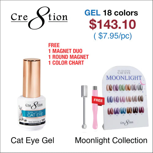 Cre8tion Cat Eye Gel 0.5oz - Moonlight Collection - 18 colors (#109-#126) w/ 1 Round Shape Magnet, 1 Magnet Duo & 1 Color Chart