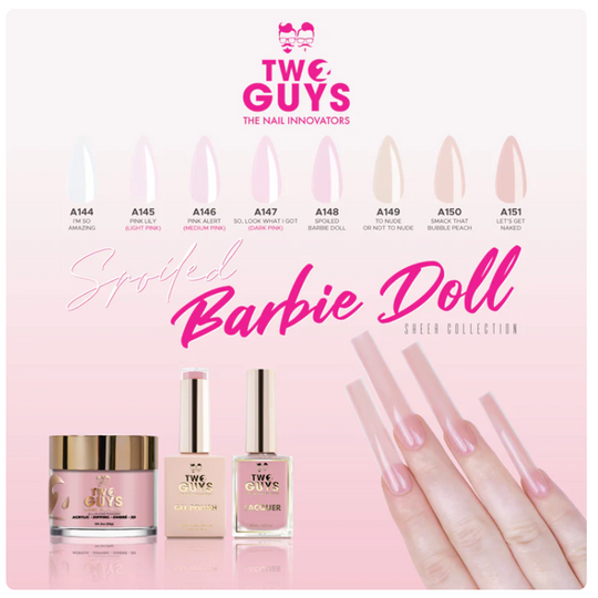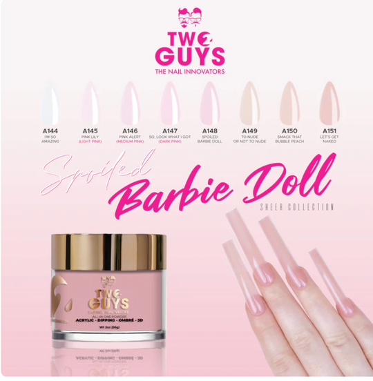 Sale -20%                        Vendor: 2Guys 2Guys SPOILED BARBIE DOLL Sheer Collection #A144 - #A151 (Powder) Sale price $96.00Regular price $120.00Our 2Guys 2in1 Acrylic Powder System is developed to be used in both dipping and sculpting methods. It’s designed to create vibrant colors and strong adhesive. Our acrylic’s medium setting time and fine texture provide great...