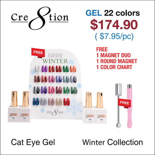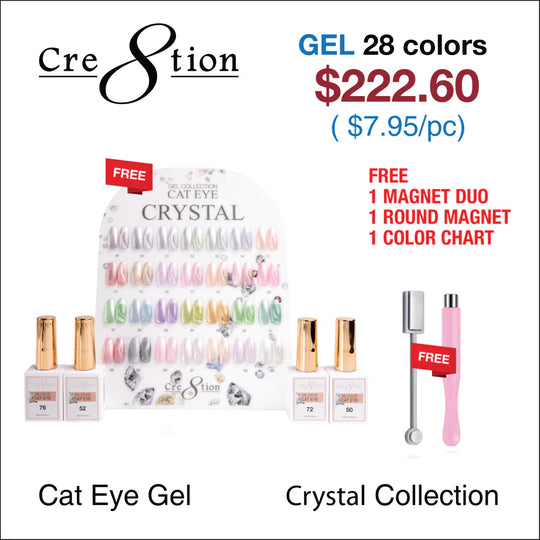 Regular price $222.60Cre8tion Magnetic Cat Eye Nail Gel – Crystal Collection Cre8tion Cat Eye Gel – Crystal Collection (0.5oz, 28 Colors)Indulge in the opulent radiance of Cre8tion’s Crystal Collection, where 28 jewel-kissed shades capture the allure of rare... -