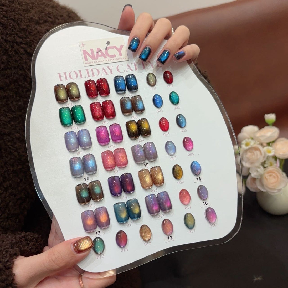 The Nacy Full Set Black Midnight Cat Eye Collection includes 10 distinct colors, designed for versatility in nail artistry. Accompanied by a free color chart display and magnets, this collection facilitates precise application and enhanced visual effects, ensuring a professional finish. Each color is optimized for durability and consistent performance.